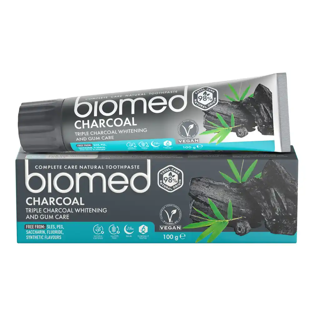 Kem đánh răng Biomed Charcoal Organic làm sạch mảng bám, dưỡng trắng răng 100g. Than tre hoạt tính kết hợp với công nghệ Nano và bromelain chiết xuất từ Dứa giúp loại bỏ mảng bám và răng trắng sáng. Canxi Hydroxyapatite và L-Arginine giúp củng cố, phục hồi men răng và giảm ê buốt. Chiết xuất từ lá bạch dương và bạc hà mang lại hơi thở thơm mát dài lâu. Nitrat Kali chiết xuất từ chuối xanh giúp chăm sóc nướu khỏe mạnh.