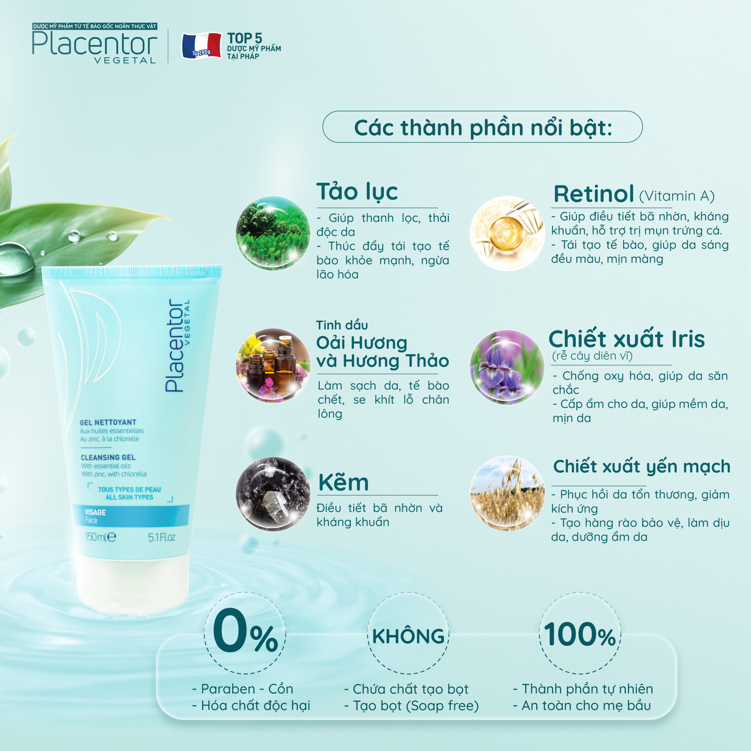 Gel rửa mặt Placentor Vegetal Cleansing Gel Face với công thức đột phá giúp làm sạch sâu và giữ ẩm với chiết xuất tinh dầu hương thảo và oải hương bên trong. Đây là 2 thành phần có khả năng làm sạch lượng bã nhờn tiết ra trên da, giúp da được sạch mịn. Khi da được làm sạch, các lỗ chân lông sẽ được thông thoáng và se khít do hiện tượng kéo căng không còn, giúp da trở nên mịn và sáng hơn. Không những thế, tinh dầu hương thảo và oải hương còn làm dịu da và ngăn ngừa mụn hiệu quả. Tảo lục có trong Placentor Vegetal Cleansing Gel có khả năng chống viêm để xử lý các vi khuẩn gây hại. Đồng thời thành phần tảo lục còn giúp thải độc da, thanh lọc và làm thông thoáng lỗ chân lông để giảm tình trạng mụn hình thành trên da (Feedback).